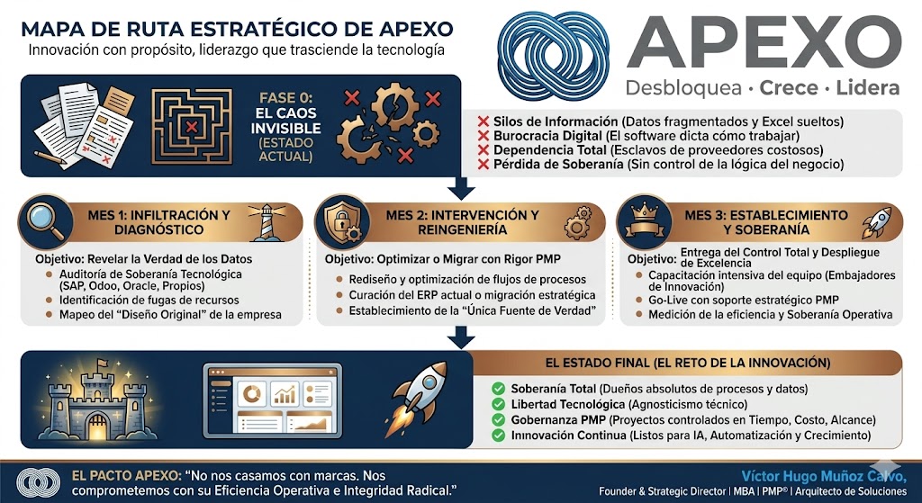 En Apexo impulsamos la transformación empresarial con soluciones tecnológicas de vanguardia, convirtiendo la innovación en crecimiento real. Con visión estratégica y ejecución impecable, ayudamos a tu empresa a maximizar su potencial y alcanzar un retorno superior. Porque la innovación no es solo tecnología, es visión: creamos un impacto duradero que transforma desafíos en oportunidades de éxito.