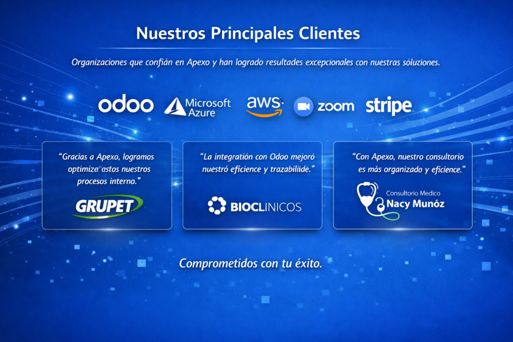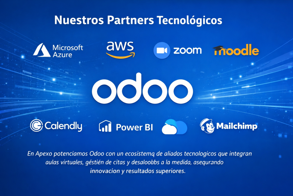 En Apexo potenciamos Odoo con un ecosistema de aliados tecnológicos que integran aulas virtuales, gestión de citas y desarrollos a la medida, asegurando innovación y resultados superiores.